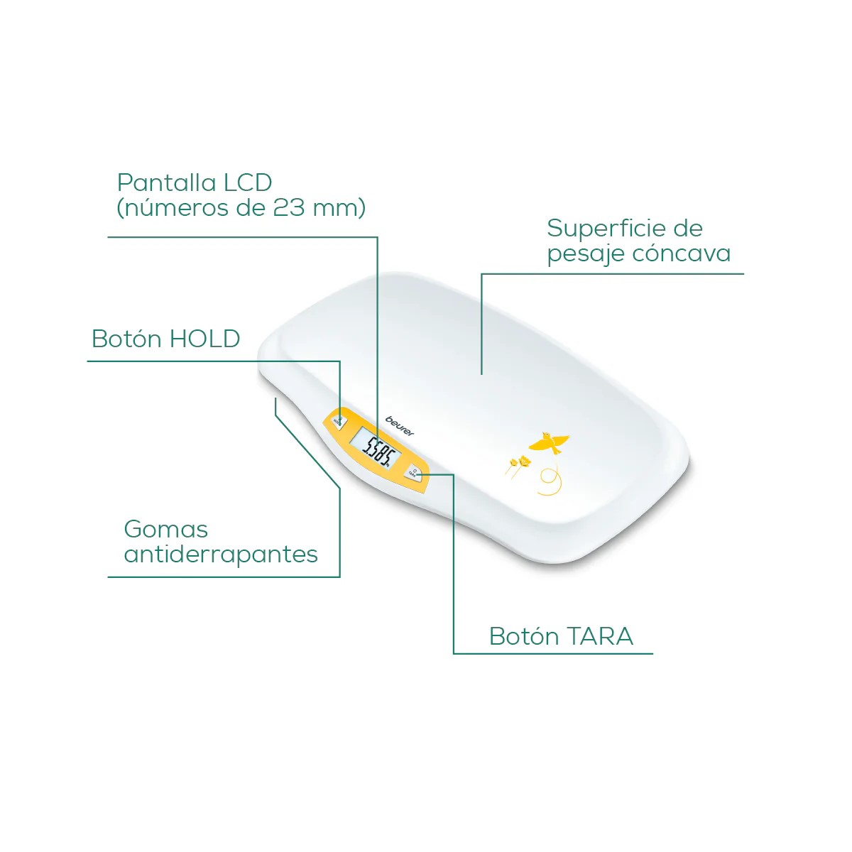 Báscula para bebés con función Hold para registrar el peso exacto aunque patalee